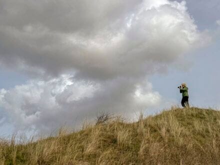 Bij het verlaten van de Slufter vorst ze de lucht. In het noordwesten hangen hoge sluierwolken, vanuit het oosten komt een diepgrijze lucht aanzetten. ‘Als die twee elkaar straks ontmoeten… daar zou ik wel wat mee kunnen.’
