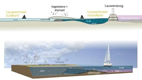 Dit initiatief verbindt zo op ingenieuze wijze beide belangen. De aanleg van twee vogeleilanden met onderwaterdrempels zorgt er voor dat er een cruciaal brakwatergebied wordt ontwikkeld én er zuiniger met het zoete water in het zuidelijke deel van het Lauwersmeer kan worden omgegaan. Daarnaast wordt ingezet op het vasthouden van zoet water op de akkers waardoor de zoetwaterlenzen versterkt worden en landbouw toekomstbestendiger wordt in een tijd van klimaatverandering.
