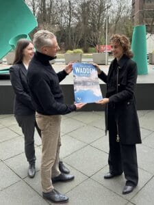 Frank Petersen en Esmé Gerbens overhandigen de Waddenkalender aan minister Hermans.