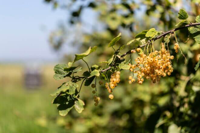 De witte aalbessen zijn de reden dat we zijn afgereisd naar deze prachtige uithoek van het Groninger land. Een vergeten vrucht die hier vaste bodem heeft gevonden. Havenga de Poel: ‘Bij alle boerderijen op de Groninger en Friese Wadden stonden vroeger rode, zwarte en witte aalbessenstruiken. Daar werden jams en sappen van gemaakt. Het is een mooi gebruik dat wij weer nieuw leven in willen blazen.’ Er staan 2.500 aalbessenstruiken in de klei, daarin is Landgoud nog steeds de enige. Van iedere struik komen kilo’s bessen. In elke fles Blanka wijn is minimaal een kilo fruit verwerkt. Terwijl de boer een paar glazen en een gekoelde fles Blanka haalt, wordt de plukmachine – een Engels exemplaar uit 1974 – schoongemaakt en is vader Ale Havenga druk bezig om alle geoogste bessen op een kar te laden. ‘Alle bessen gaan vandaag nog bij -18 graden in de vriezer. Omdat ze geoogst zijn met de machine, zijn ze allemaal een beetje gekneusd. Als we ze gaan gebruiken, komen de suikers daardoor nog beter tot hun recht. En dat komt de smaak van de wijn ten goede.’ Havenga de Poel vergelijkt die met een Duitse Riesling. ‘Het is een lichte wijn met een frisse zoete smaak en een hele kleine sprankeling.’ De frisse tinteling blijkt heerlijk op deze zomerse dag.