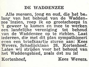 Kees Wevers, oprichter van de Waddenvereniging, plaatst zaterdag 15 augustus een oproep in de Telegraaf, de Leeuwarder Courant en het Dagblad van het Noorden. Hij plaatst deze advertentie om medewerkers, vrijwilligers en bestuursleden die zich de afgelopen vijftig jaar hebben ingezet voor de Waddenvereniging te wijzen op een reünie op 12 en 13 september. Vijftig jaar geleden plaatste Wevers ook al een oproep in diverse landelijke en regionale kranten. Daarin spoorde hij destijds mensen aan om in actie te komen tegen de inpolderingsplannen voor het wad en samen met hem een landelijke vereniging tot behoud van de Waddenzee op te richten.