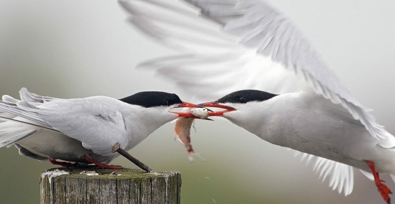 Tijdens de balts zit het vrouwtje vaak op dokpalen, steigers of in de kolonie te wachten op het mannetje die prooien aandraagt. Zodra het mannetje in de buurt komt, zie je duidelijk aan het nerveuze, schreeuwende gedrag van het vrouwtje dat er een prooi-overdracht gaat plaats vinden. Dit gaat bliksemsnel, dus door goed te observeren en tijdig de ontspanknop van de camera in te drukken heb je de meeste kans op het vastleggen van dit fenomeen.