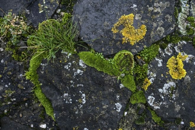 Net als aan natuurlijke rotskusten zijn banden van verschillende soorten korstmossen zichtbaar op dijken, veroorzaakt door de mate waarin die soorten tegen zout water en onderdompeling kunnen. Van boven naar beneden: een grijze band met onder meer kusttakmos, een gelige band met vooral citroenkorst en een zwarte band – waar het zeewater al overheen klotst – met bijvoorbeeld zeepokkorst.