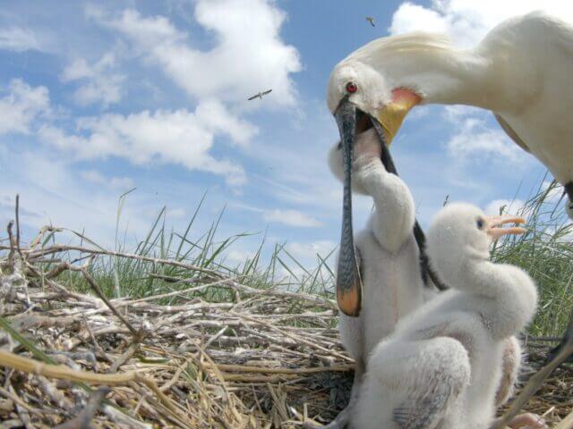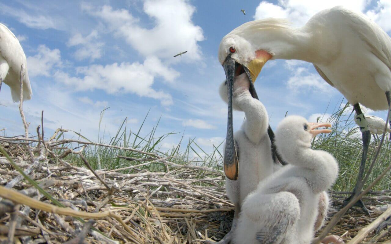 Het filmwerk begon in het broedgebied, onze eigen Waddeneilanden, en op de vastelandskwelders waar de dieren verzamelen om op te vetten voor de grote tocht naar het zuiden. ‘Ik mocht eerst mee met wetenschappers op de kwelder van Schiermonnikoog. Zij ringen en wegen geregeld jongen en ik kon daardoor zonder extra verstoring heel mooie beelden maken. Ik heb er als student ook al onderzoek gedaan en dus voelde ik me er alweer erg snel thuis.’ Jansma filmde zelf, maar plaatste ook gecamoufleerde camera’s en legde zodoende van dichtbij de zorg van de lepelaars voor hun kroost vast. ‘Het is heel aandoenlijk om te zien hoe de ouders die kleine donzige jongen voeren. Dat is wel een manier om de kijker voor de lepelaar te winnen.’