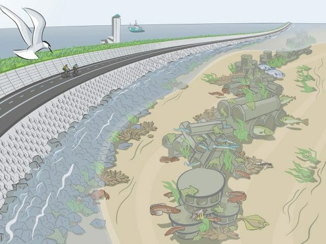 Wat de marien ecoloog terugbrengt bij zijn droom. De versterking van de Afsluitdijk vanwege de verwachte zeespiegelstijging en vaker optredende stormen door klimaatopwarming is nog in uitvoering. Waarom dan niet de al aanwezige infrastructuur voor de vernieuwing van de dijk gebruiken om kunstmatige riffen te realiseren zoals die bij Lauwersoog?’, mijmert Van der Heij.