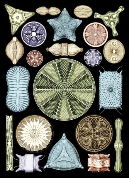 Kiezelwieren zijn mooi, bijzonder en belangrijk. Het zijn eencellige algen die de basis vormen van het hele ecosysteem van de Waddenzee. Kiezelwieren, ook bekend als diatomeeën, zijn primaire producenten, wat betekent dat ze via fotosynthese zonne-energie omzetten in organische stoffen. Zo vormen ze het begin van de voedselketen; kiezelwieren dienen als voeding voor zoöplankton, kleine vissen en andere mariene organismen. Bovendien zijn ze belangrijke zuurstofproducenten (zie kader ‘De échte longen van de aarde’).