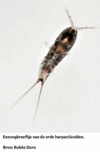 Roeipootkreeftjes of copepoden zijn er in allerlei soorten en maten. Soorten van de orde van de harpacticoïden leven meestal in of nabij de bodem en zijn vaak maar enkele millimeters lang. Het eerste paar antennes is heel kort, in tegenstelling tot die van in de waterkolom levende soorten. Het voedsel van harpacticoïde copepoden (hierna: copepoden) bestaat uit bacteriën en fijn organisch materiaal.