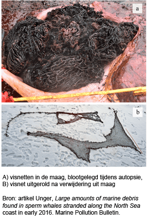 Van 22 van de 30 begin dit jaar gestrande potvissen is de maaginhoud geanalyseerd. In negen vond men aanzienlijke hoeveelheden afval dat door menselijk handelen in de Noordzee terecht was gekomen. Zo bleken de magen van twee van de zes bij Texel aangespoelde dieren vishaken en vislijnen, linten van ballonnen, verpakkingsmateriaal en landbouwplastic te bevatten. Delen van netten, stukken touw, een plastic emmer en een afdekplaat van een automotor vond men in magen van de in het Duitse waddengebied aangetroffen potvissen. Een van deze dieren had zelfs een net van 13,5 meter lang en 1,2 meter breed tot zich genomen.